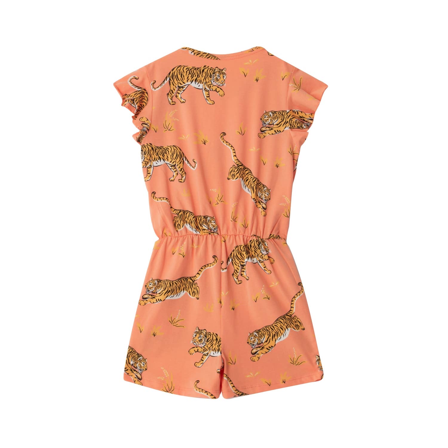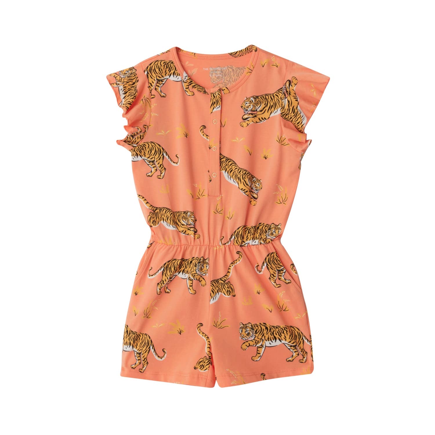 Short-sleeved playsuit in soft cotton jersey with an allover tiger print